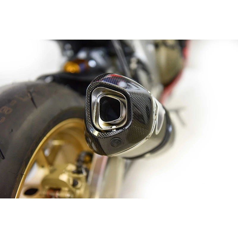 Il sistema completo è realizzato in: collettori in acciaio inox, camicia in carbonio, fondello in Carbonio, fascette sotto rivetto, logo Rivettato.