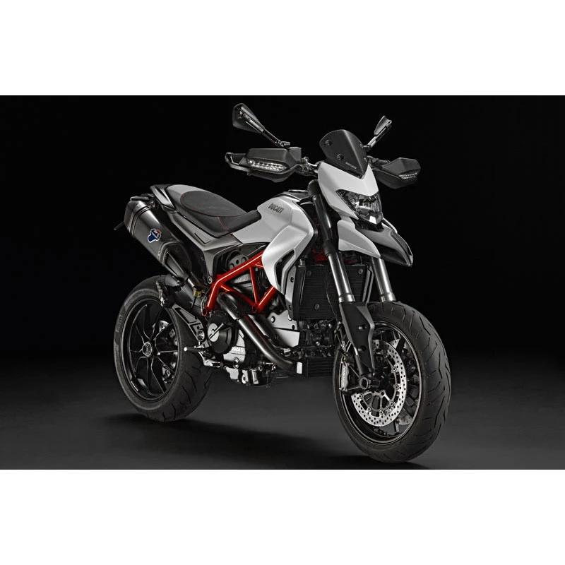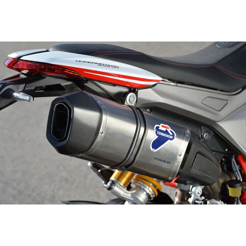 Prodotto da Termignoni (96480031A). Con silenziatore in titanio e fondello in carbonio in posizione rialzata per aumentare l’aspetto dinamico della moto. L’impianto libera la potenza del nuovo motore 821cc, esaltandone le doti di guidabilità ed erogazione. La riduzione di peso ed i livelli di potenza e coppia che aumentano del 5% non fanno altro che mettere in mostra le qualità sportive della Hypermotard per un piacere di guida senza eguali. Il sistema comprende anche un coperchio filtro aria per una migliore efficienza fluidodinamica e le frecce posteriori a LED per un aspetto ancora più accattivante. UP-MAP NON INCLUSA