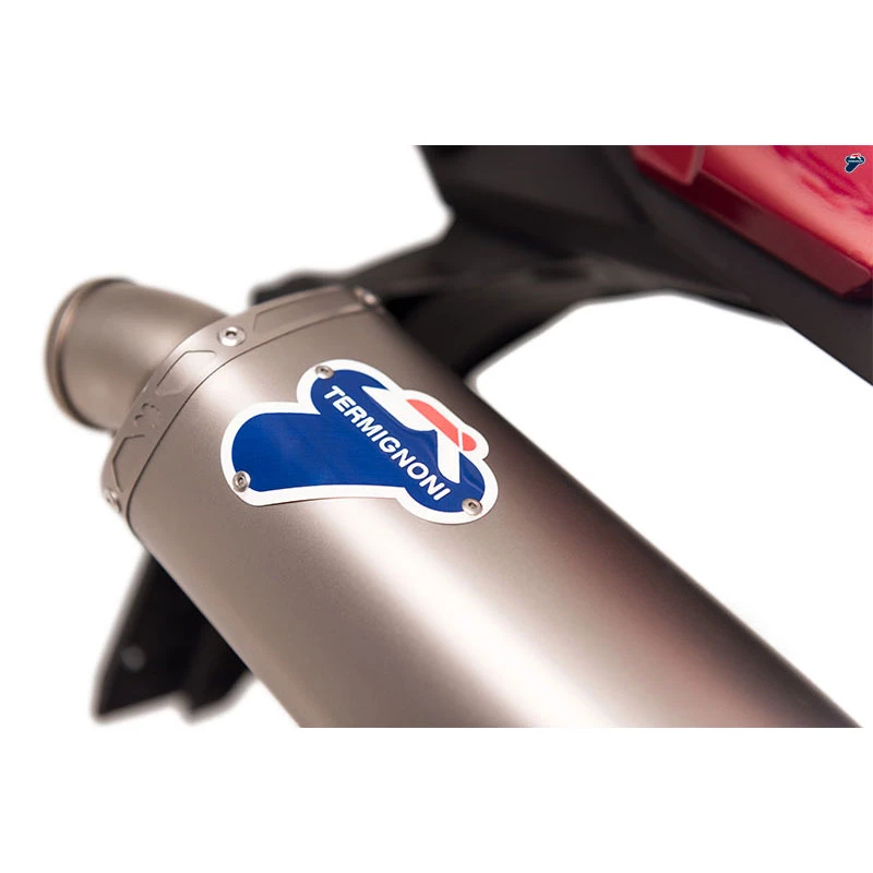 Il silenziatore OMOLOGATO EURO 4, è caratterizzato da una camicia realizzata in Titanio con lo storico logo metallico rivettato.