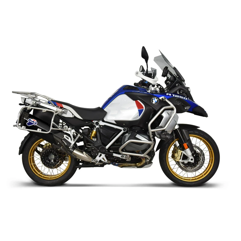 Termignoni presenta il nuovo silenziatore omologato dedicato a BMW R 1250 GS e GS 1250 ADV (Anno 2019). Materiale: Termignoni ha sviluppato il silenziatore omologato, realizzato in acciaio inox, camicia in titanio con colorazione nera ad alta temperatura, fondello in carbonio e paracalore in carbonio. Il silenziatore è corredato dallo storico logo metallico e compreso di DB Killer saldato e staffa in alluminio. Il silenziatore Termignoni pesa 4200 gr contro i 5200 gr dello scarico di serie, con un risparmio di peso di 1000 gr.